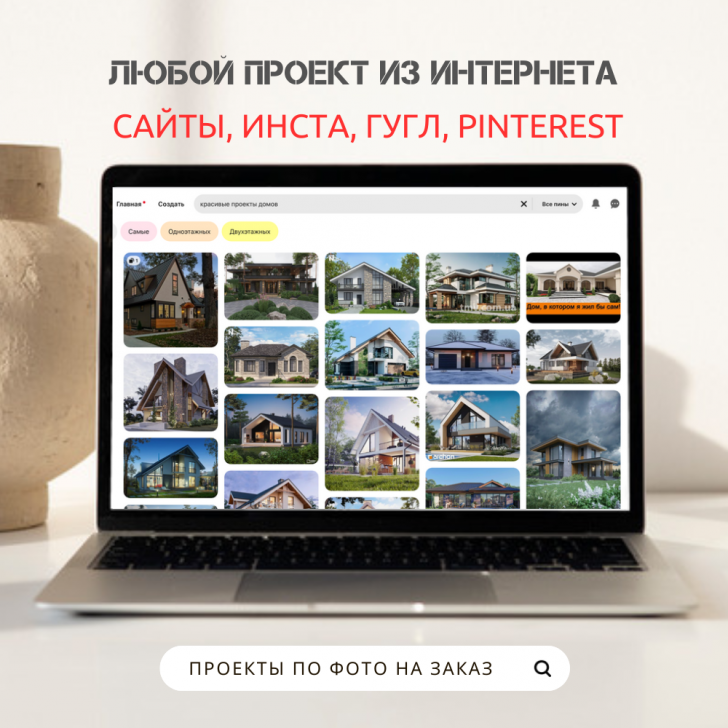 Проекты из Интернета - с сайтов архитектурных фирм, из поиска (google, yandex и др.), instagram, pinterest и др., или по вашему эскизу, фотографии любого дома или коттеджа.